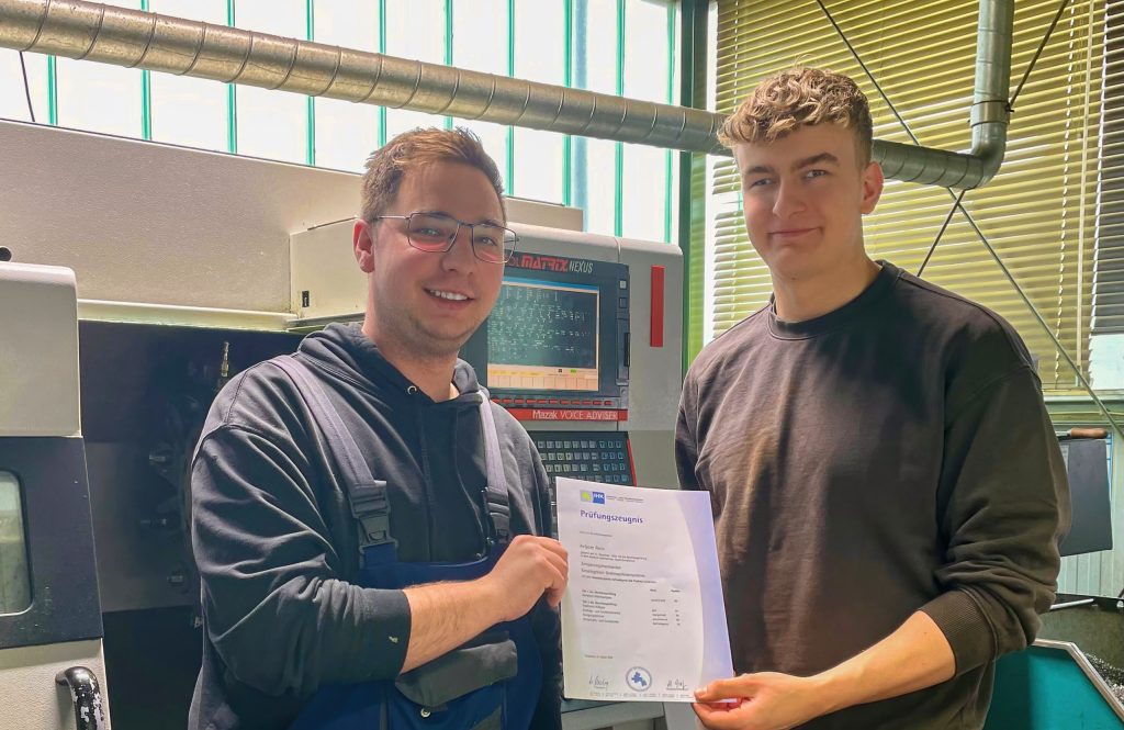 Artjom Rein (rechts im Bild) hat am 27.01. seine Gesellprüfung als Zerspanungsmechaniker bestanden. Sein Ausbilder Markus Rohde (links im Bild) übergibt ihm sein Zeugnis.